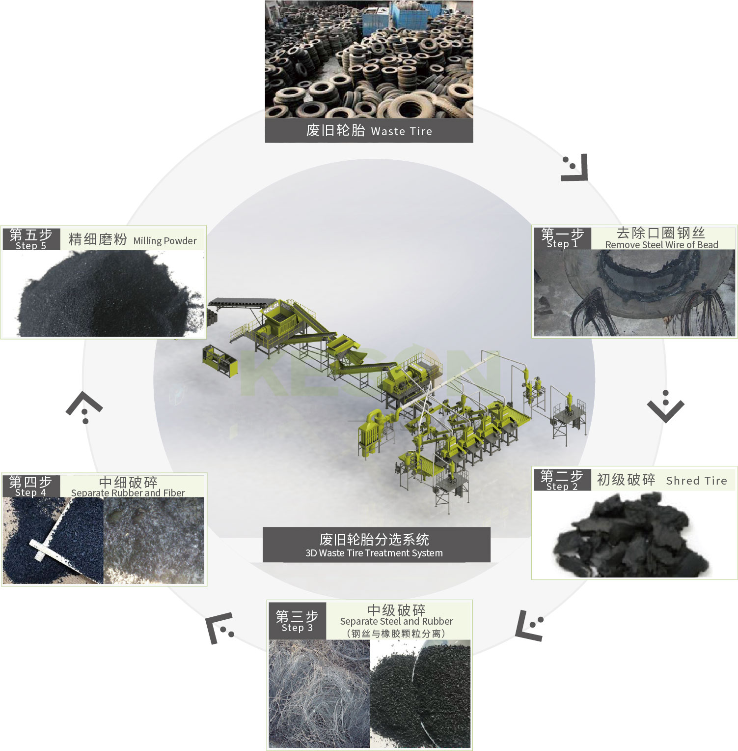 江苏科选环境科技有限公司自主研发的废旧轮胎智慧处理系统,通过“输送系统+一级破系统+尺寸筛分系统+钢丝分离系统+二级破碎系统+磨粉系统+纤维分离系统+除尘系统”的技术将完整的轿车胎、轻型卡车胎、重卡胎制成TDF(轮胎衍生燃料)胶粒、胶粉,广泛应用于水泥厂、火力发电厂、高速道路铺设、再生橡胶制品等。