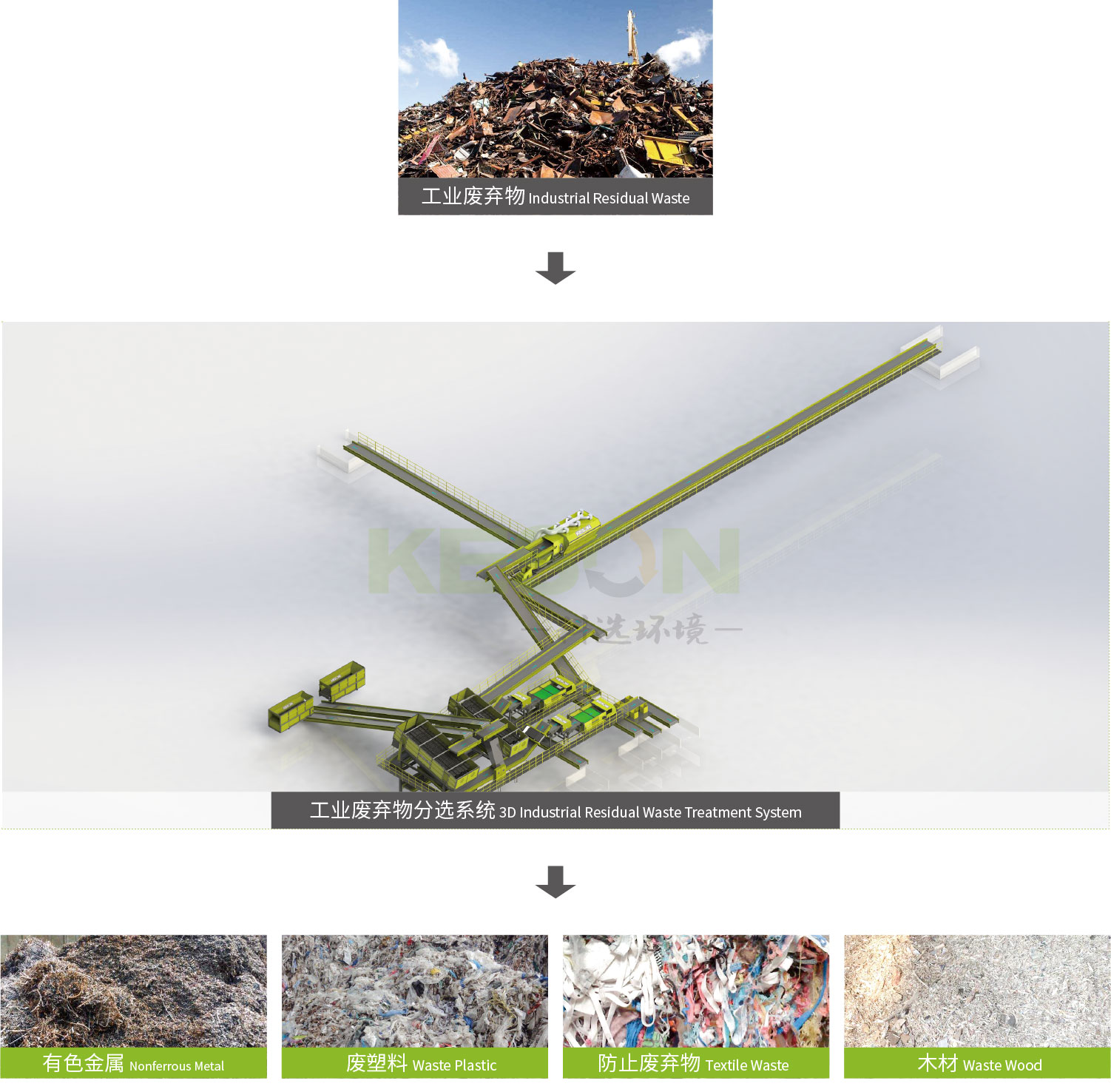 针对一般工业垃圾的综合回收与利用,江苏科选环境科技有限公司开发研制的工业废弃物智慧处理系统,通过“输送系统+破碎系统+筛分系统+清洗系统+造粒系统”技术,可对城市工业废弃物破碎细化处理,以减少体积,便于后续加工处理和燃烧发电,系统配置智能降尘系统,可处置运行过程中产生的粉尘,减少二次污染。