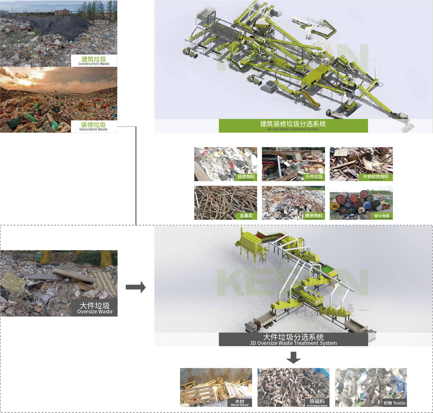 江苏科选环境科技有限公司自主研发的建筑(拆迁)装修垃圾处理系统具有“先进性,节能性,智能性,安全性,环保性,成长性”的特点,通过“三筛两破”的工艺完美处理不同地域复杂多样的物料,真正的做到将垃圾变废为宝,作为城市建设的有用之材。