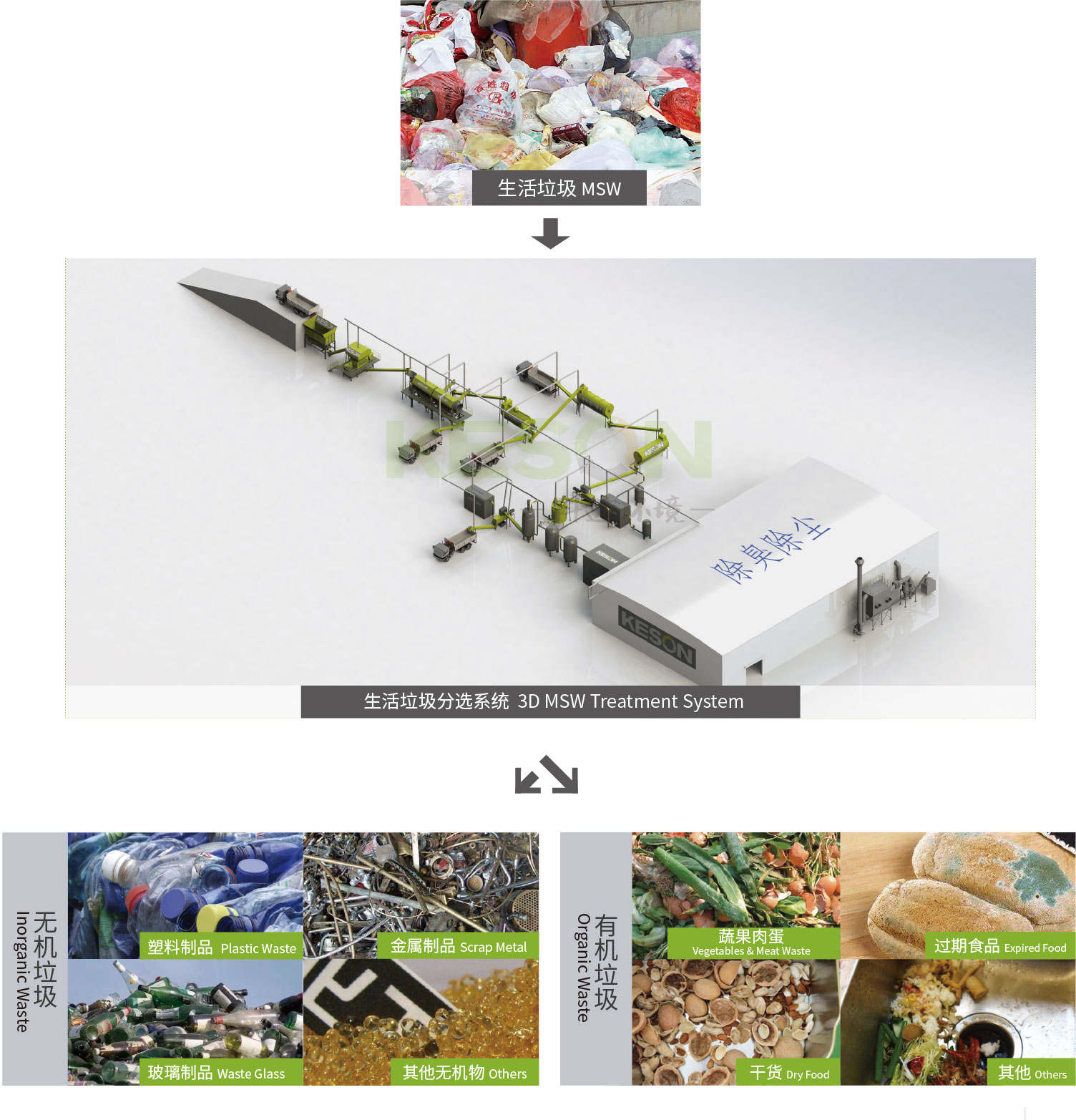江苏科选环境科技有限公司自主研发的生活垃圾智慧处理系统具有“减量化、无害化、就地化、资源化”的特性,本系统通过“均匀布料系统+破袋系统+尺寸筛分系统+除铁系统+比重筛分系统+AI智能精细分选系统+自动打包系统”的配置,可高效分拣岀生活垃圾中的湿垃圾、可回收垃圾、其他垃圾等。